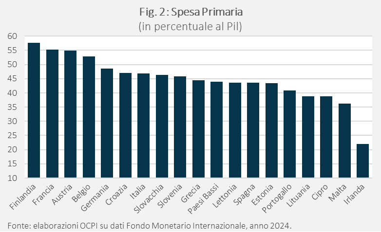Una parte della differenza rispetto agli altri Paesi è dovuta alla maggiore spesa per interessi che è la conseguenza di un alto debito pubblico e di uno spread che, rispetto agli altri Paesi e malgrado i rilevanti progressi degli ultimi anni, è ancora il più alto dell’eurozona. Se si guarda alla spesa primaria, ossia al netto degli interessi sul debito, l’Italia, con il suo 46,8%, si colloca al settimo posto e dunque migliora al sua posizione relativa (Fig.2).[2] In particolare viene superata anche dalla Germania (48,6%) e dalla Croazia (47%).