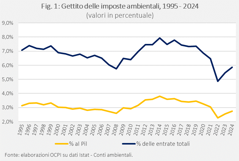 Nel 2024 il gettito delle imposte ambientali, quelle volte a ridurre le attività inquinanti, in Italia ammontava a 61 miliardi di euro (2,8% del Pil), proveniente soprattutto dalle accise sui carburanti e dalle imposte sull’energia elettrica. Dal 3,8% nel 2014 il gettito è sceso per la diffusione di fonti meno inquinanti e per gli interventi di detassazione in risposta alla crisi energetica. La tassazione ambientale in Italia supera la media UE (2% del Pil), ma l’impatto di queste imposte è in parte compensato dai sussidi ambientalmente dannosi, che nel 2022 valevano 24 miliardi.