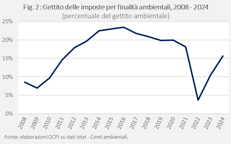 All’interno delle imposte ambientali, svolgono un ruolo particolare quelle il cui gettito è destinato a finanziare espressamente politiche verdi (imposte per finalità ambientali). Queste imposte “di scopo”, tra cui gli oneri per la produzione da fonti rinnovabili (destinati direttamente ai produttori) e l’imposta per depositare rifiuti in discarica (“l’ecotassa”), si riducono dal 23% del totale nel 2016 al 15% nel 2024 (Fig. 2).[6]