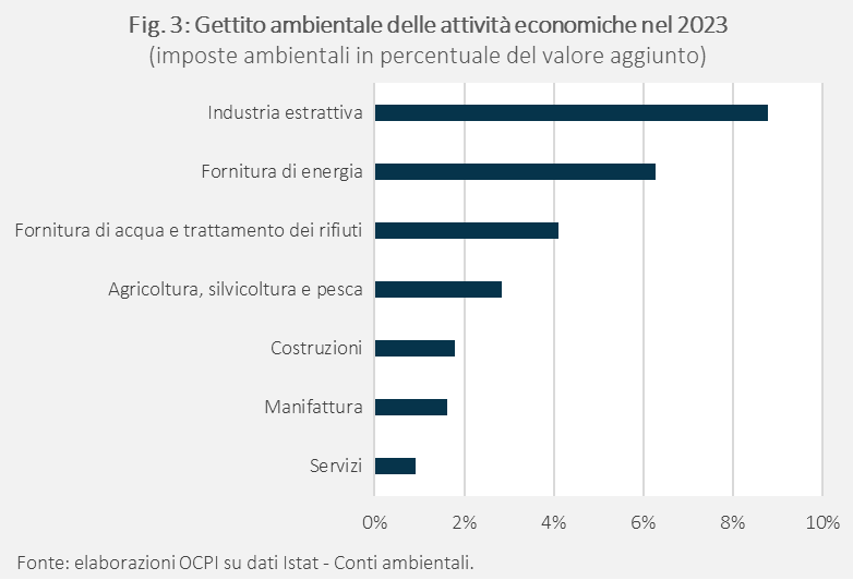 Le imposte ambientali pesano, rispetto al valore aggiunto del settore, in modo più marcato per l’industria estrattiva (8,8%, Fig. 3) e la fornitura di energia (6,3%). Nei servizi, invece, il peso è minimo (0,9%), perché le attività relative generano poche emissioni.