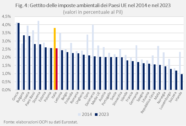 Nella classifica dei Paesi europei per peso delle imposte ambientali, l’Italia era all’ottavo posto nel 2023 (ultimo anno per cui si hanno dati confrontabili), sopra la media UE (Fig. 4). Siamo arretrati rispetto al 2014, quando eravamo al quinto posto. Dal 2014 il rapporto è calato in tutti i Paesi, tranne la Bulgaria, per le misure adottate contro la crisi energetica del 2022 e per il graduale passaggio alle energie rinnovabili.[7] Le imposte ambientali infatti, quando efficaci, riducono le attività inquinanti, erodendo la propria base imponibile e gettito.