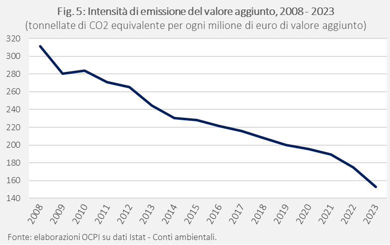 Le imposte ambientali, e in particolare quelle sui combustibili, possono ridurre le emissioni in atmosfera, influenzando le scelte di produttori e consumatori aumentando i costi legati al consumo di prodotti inquinanti. In effetti, l’intensità di emissione del valore aggiunto, cioè le tonnellate di CO2 equivalente per milione di euro di valore aggiunto generato, è scesa da 311 tonnellate nel 2008 a 153 nel 2023 (Fig. 5).[8]
