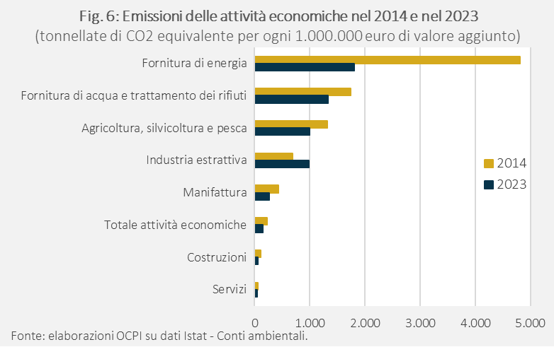 La riduzione è stata particolarmente forte nel settore della fornitura di energia, da 4.800 a 1.800 tonnellate di CO2 equivalente tra il 2014 e il 2023 (Fig. 6). In generale, l’intensità di emissione è diminuita in tutti i settori tranne nell’industria estrattiva, dove è aumentata.