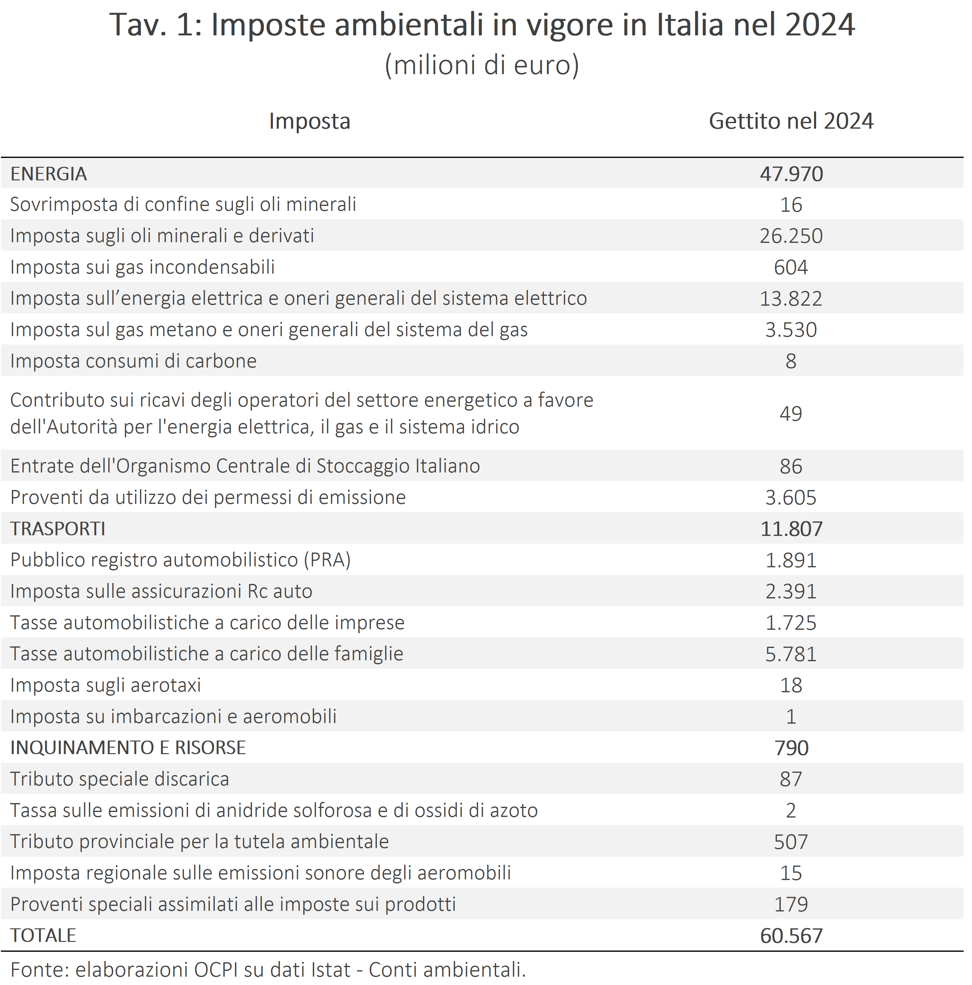 Il concetto di imposte ambientali è stato introdotto dalla Commissione Europea per identificare le imposte volte a limitare attività dannose per l’ambiente.[2] Queste imposte fanno parte degli strumenti “di mercato” (market-based) per orientare i comportamenti di imprese e consumatori attraverso incentivi finanziari.[3] L’imposta aumenta i costi dell’attività inquinante, scoraggiandola. In Italia, nel 2024 esistevano 20 imposte ambientali (Tav. 1), per un gettito di 60,6 miliardi di euro (2,8 del Pil), 31,1 a carico delle famiglie e 28,4 delle imprese.[4]