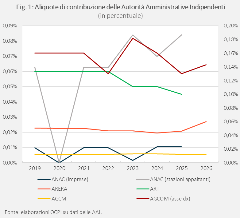 Dal 2019, le aliquote di contribuzione si sono ridotte dell’11% per l’AGCOM e del 25% per l’ART. Sono invece aumentate le aliquote dell’ARERA (18,7%) e dell’ANAC (34% per gli enti appaltanti e 6% per le imprese; Fig. 1). Quelle di AGCM e ANAC per le imprese sono rimaste sostanzialmente stabili.