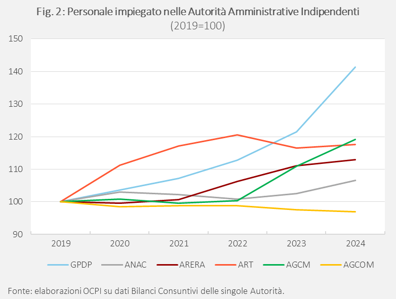 Questi aumenti sono stati legati alla spesa per il personale, principale voce di bilancio delle AAI, cresciuta del 95% per il GPDP, del 74% per l’ART, del 66% per l’ANAC, del 49% per l’ARERA, del 45% per l’AGCM. Solo AGCOM ha registrato aumenti più contenuti (24%). A titolo di riferimento, l’aumento della spesa per il personale delle amministrazioni pubbliche è stato del 13,8% nello stesso periodo.[13]
