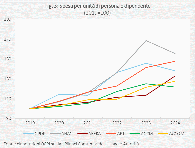 Il forte aumento delle spese per il personale è dovuto sia all’aumento del numero di dipendenti sia al costo medio per dipendente. L’aumento del numero di dipendenti è particolarmente forte per il GPDP (41%), ma è rilevante anche per l’AGCM (19%), l’ART (17,6%) e l’ARERA (13%). L’aumento è invece contenuto per ANAC (6,6%), mentre AGCOM registra una riduzione del 3% (Fig. 2). Gli aumenti delle retribuzioni per dipendente sono elevati in tutte le AAI (Fig. 3): dal 2019 al 2024, il costo medio per dipendente è aumentato del 56% per ANAC, del 48% per ART, del 38% per GPDP, del 33% per ARERA, del 27,6% per AGCOM e del 22% per AGCM.[14]