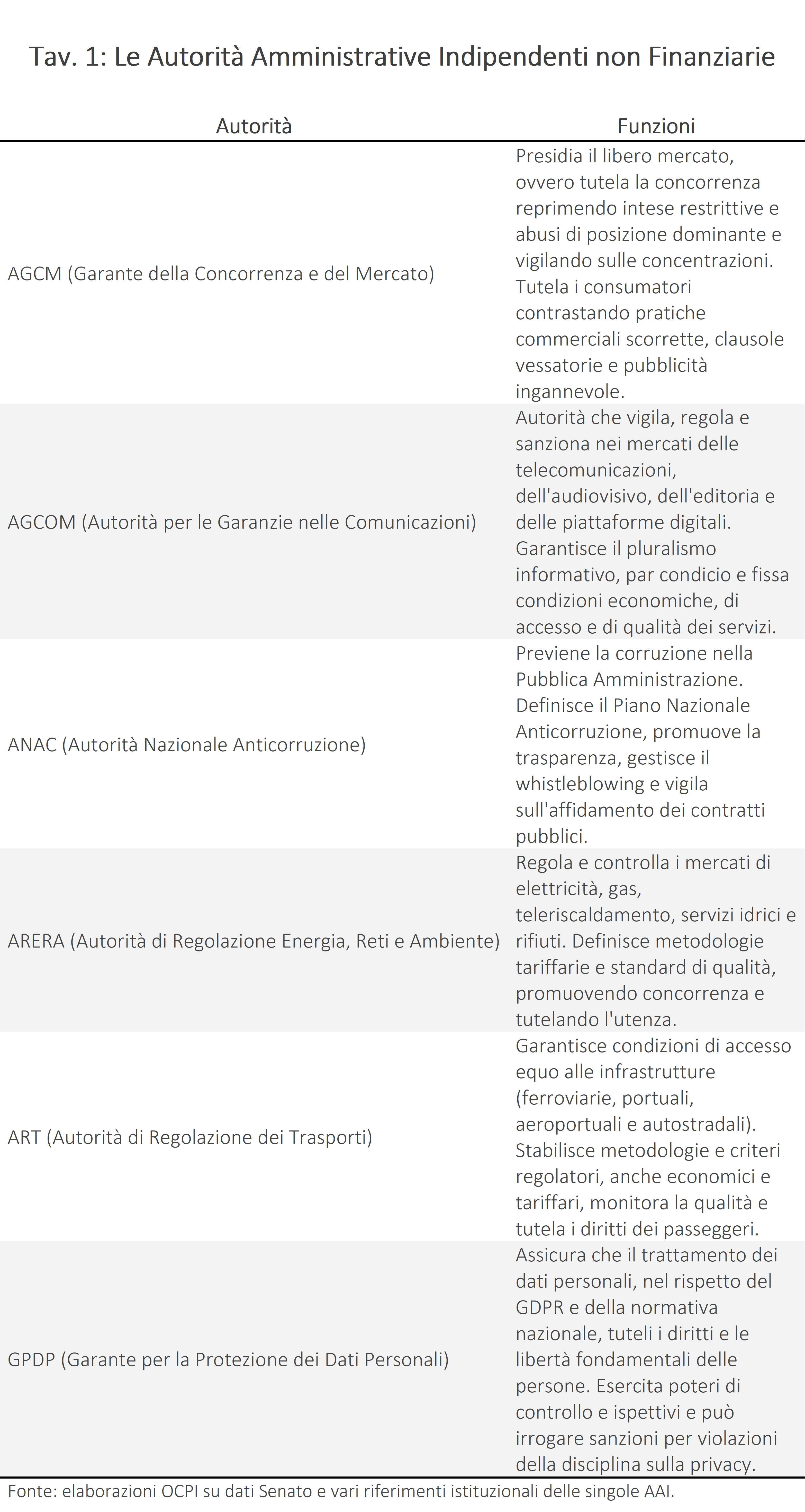 Questa nota si concentra sulle AAI di tipo non finanziario, attive nei settori dei trasporti, delle comunicazioni, dell’energia, delle reti e dell’ambiente, dei dati personali, dell’anticorruzione e della concorrenza (vedi Tav. 1 per l’elenco e i relativi acronimi).