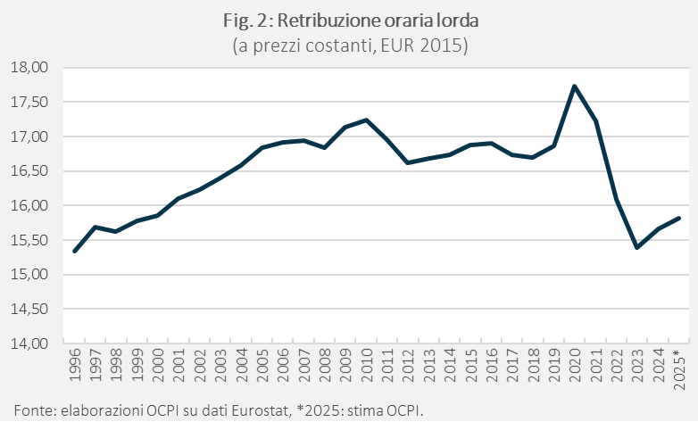A conferma di questi andamenti, i dati Eurostat (disponibili solo dal 1995) mostrano che le retribuzioni orarie lorde si collocano oggi sostanzialmente sugli stessi livelli di fine anni Novanta (Fig. 2). Esse risultano piuttosto stabili lungo tutto il periodo pre-pandemia, con l’unica eccezione rappresentata dal picco del 2020 (dovuto al fatto che, durante i lockdown, le ore lavorate si sono ridotte, ma in generale i lavoratori continuarono a percepire un reddito). La successiva perdita del potere d’acquisto, nel periodo 2020-2023 è molto più intensa di quella della retribuzione per dipendente, perché in questo periodo sono aumentate le ore lavorate, in gran parte per via della conversione a tempo indeterminato dei part-time involontari.
