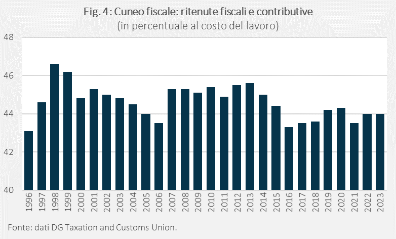 Quanto al cuneo fiscale è difficile individuare una tendenza discendente (Fig. 4). Vi è una netta riduzione a cavallo del secolo, quando il cuneo scende dal picco di 46,6% del 1998 al 43,5% nel 2006. Il cuneo risale attorno al 45,5% negli anni successivi per poi attestarsi attorno al 44% dal 2016 in poi. Una rilevante discesa c’è stata sicuramente nel 2024 e nel 2025.[3]