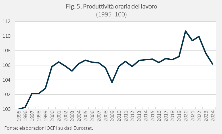 All’origine di questi andamenti è difficile non vedere il problema della bassa crescita della produttività. Negli ultimi trent’anni, la produttività oraria del lavoro (intesa come Pil diviso per le ore lavorate) è aumentata solo del 6% (Fig. 5). Vi è stato un aumento nella seconda metà degli anni 90, cui ha fatto seguito un lunghissimo periodo di assoluta stazionarietà dal 2000 al 2019. Dopo un picco nel periodo 2020-2022 (verosimilmente connesso alle difficoltà di misurazione durante la pandemia), vi è stato un crollo che ha riportato la produttività al livello medio del periodo 2000-2019. La caduta della produttività dopo il 2020 appare strettamente correlata con la caduta del salario reale.