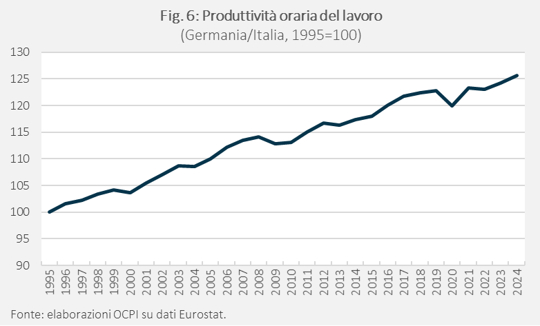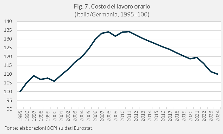 Non è così per il costo del lavoro. Il rapporto fra il costo del lavoro orario in Italia e in Germania aumenta del 35% fra la metà degli anni Novanta e il 2009 per poi diminuire fino a quota 110 nel 2024, il che significa che rimaneva del 10% più alto dell’inizio del periodo considerato (Fig. 7).
