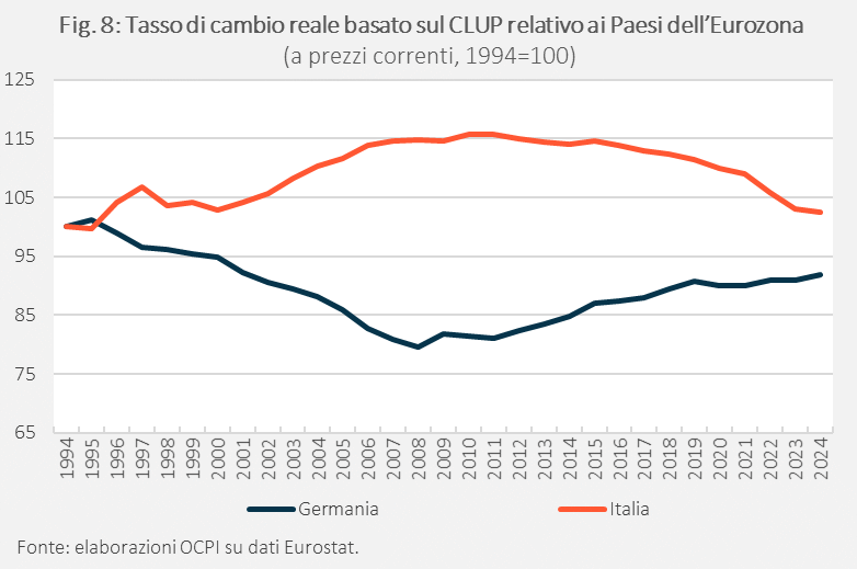 In conseguenza di questi andamenti, il tasso di cambio reale basato sul costo del lavoro per unità di prodotto (CLUP) e relativo ai Paesi dell’eurozona, si è apprezzato (con conseguente perdita di competitività) dal 2000 al 2011; successivamente, la stagnazione dei salari reali ha consentito di recuperare competitività; tuttavia, il livello di competitività della metà degli anni Novanta venne recuperato solo nel 2024 (Fig. 8). Nello stesso periodo, e fino al 2009, la Germania ha guadagnato competitività. Successivamente vi è stata una lenta ricomposizione all’interno dell’eurozona, che ha comportato un ritorno della competitività tedesca in prossimità dei livelli della metà degli anni Novanta.