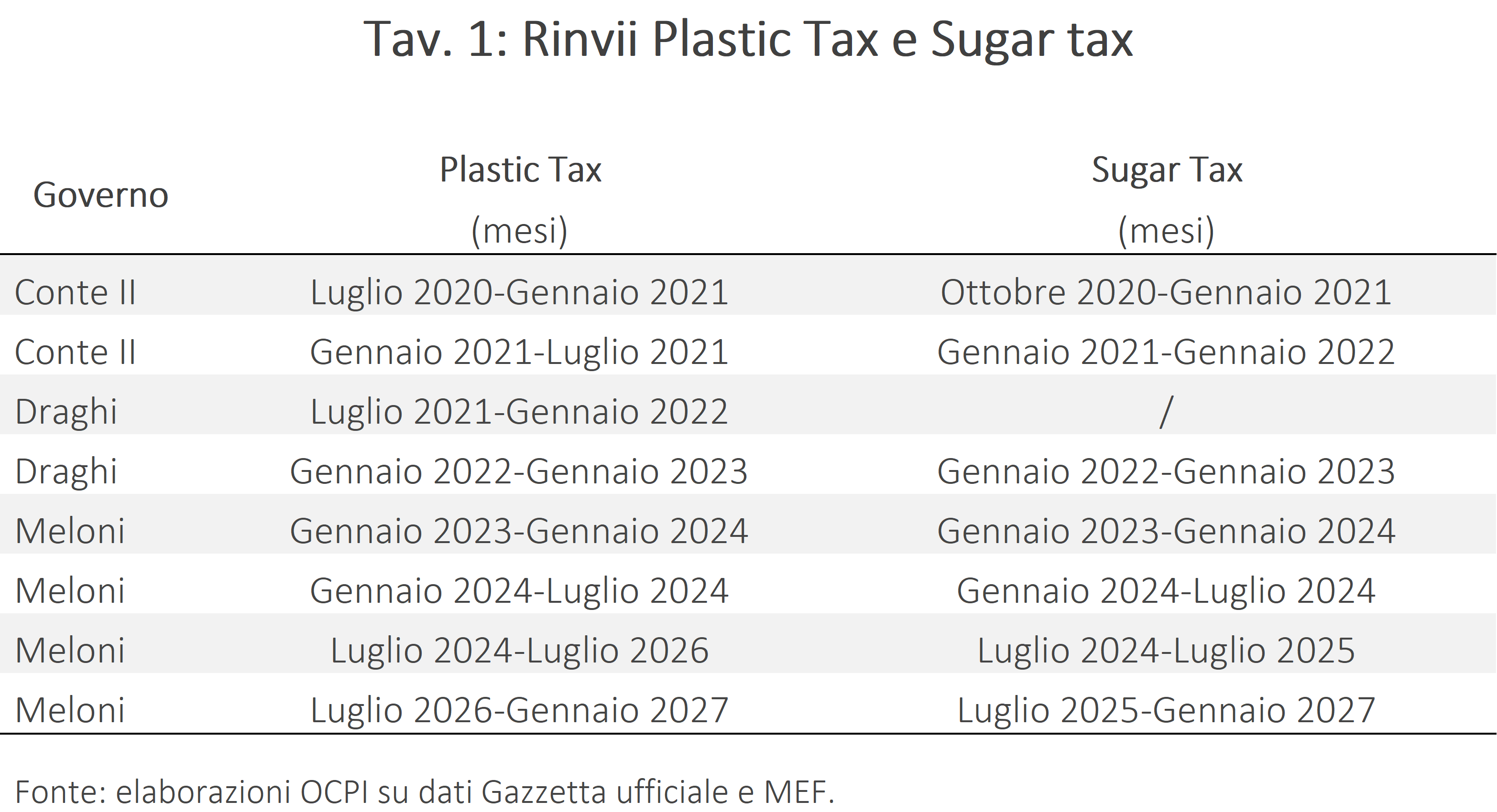 Dal 2020 la legislazione italiana ha istituito due imposte, la Plastic Tax e la Sugar Tax, concepite per scoraggiare il consumo di prodotti come la plastica monouso e le bevande zuccherate, che hanno effetti ambientali e sanitari negativi. Tuttavia, l’introduzione di entrambe le imposte è stata rinviata per otto volte. I continui rinvii, oltre a ridurre la credibilità e la capacità deterrente delle imposte, generano incertezza per le imprese, incidono sui conti pubblici, e migliorano solo artificialmente il profilo delle finanze statali di medio termine.