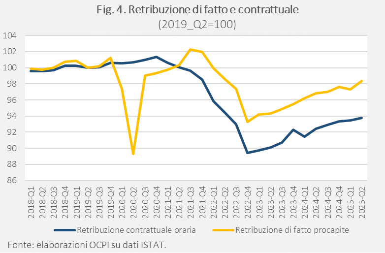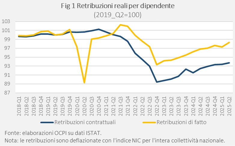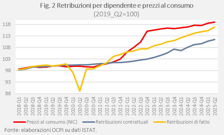 Un secondo motivo di divergenza è che alcuni privilegiano l’analisi delle retribuzioni contrattuali. Come si vede nelle figure 1 e 2, le retribuzioni contrattuali si riprendono più lentamente di quelle di fatto. Al riguardo va ricordato che questa variabile coglie solo l’andamento dei contratti nazionali di categoria e non coglie gli effetti sulle retribuzioni effettive dei contratti di prossimità (aziendali e territoriali), nonché di altre voci della retribuzione, come straordinari, indennità, compensi accessori o occasionali. Nello stesso periodo considerato sopra (2025_Q2 su 2019_Q2) le retribuzioni contrattuali hanno perso il 6,4% in termini di potere d’acquisto. È corretto guardare alle retribuzioni di fatto, che sono calcolate da Istat come monte retributivo diviso il numero di occupati dipendenti. Si guardi, ad esempio, il 2020. Molte persone non hanno potuto lavorare durante le fasi più acute dei lockdown Covid e hanno fruito della Cassa integrazione che non è una variabile retributiva; il conseguente calo delle retribuzioni è colto dalla variabile “retribuzioni di fatto”, ma non da quello della retribuzione contrattuale.