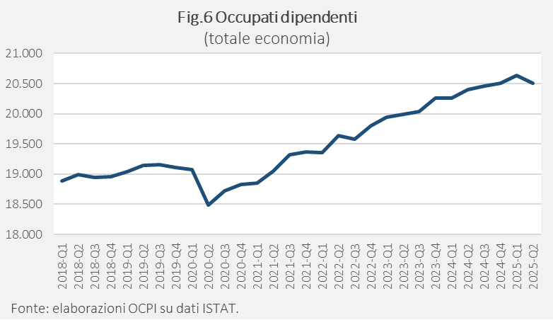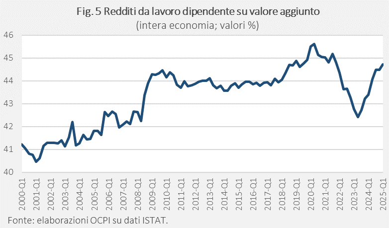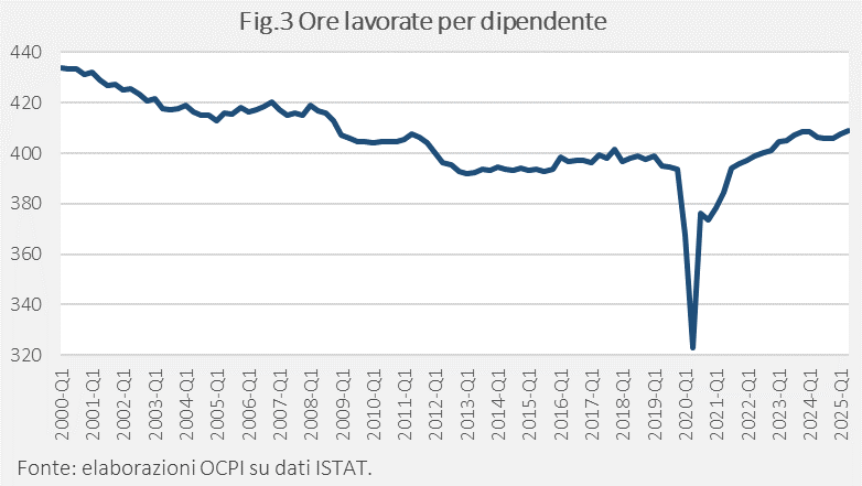 Tra la fine del 2022 e il secondo trimestre del 2025, le ore lavorate per dipendente sono aumentate del 2%, il che significa che la retribuzione oraria di fatto è cresciuta del 3% (Fig. 3). Si noti peraltro che la ripresa, dopo il crollo dovuto ai lockdown, ha riportato le ore lavorate su valori prepandemici e comunque ben sotto la media del decennio precedente (anche se qui vi è da chiedersi come vengano calcolate le ore di smart working che sono senz’altro molto aumentate rispetto a prima).