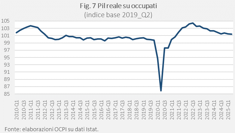 A conferma di questa conclusione è utile esaminare la Figura 7 che mostra due cose: la stagnazione della produttività del lavoro (Pil reale su occupati) dal 2010 al 2020 e il calo – davvero notevole – della produttività dalla fine del 2022. Da allora l’occupazione è aumentata più del Pil (reale) ed è quindi diminuita la produttività. L’economia italiana non sembra capace di produrre quegli aumenti di produttività che alla lunga sono gli unici che possono generare miglioramenti del tenore di vita e sostenibilità del sistema di welfare.