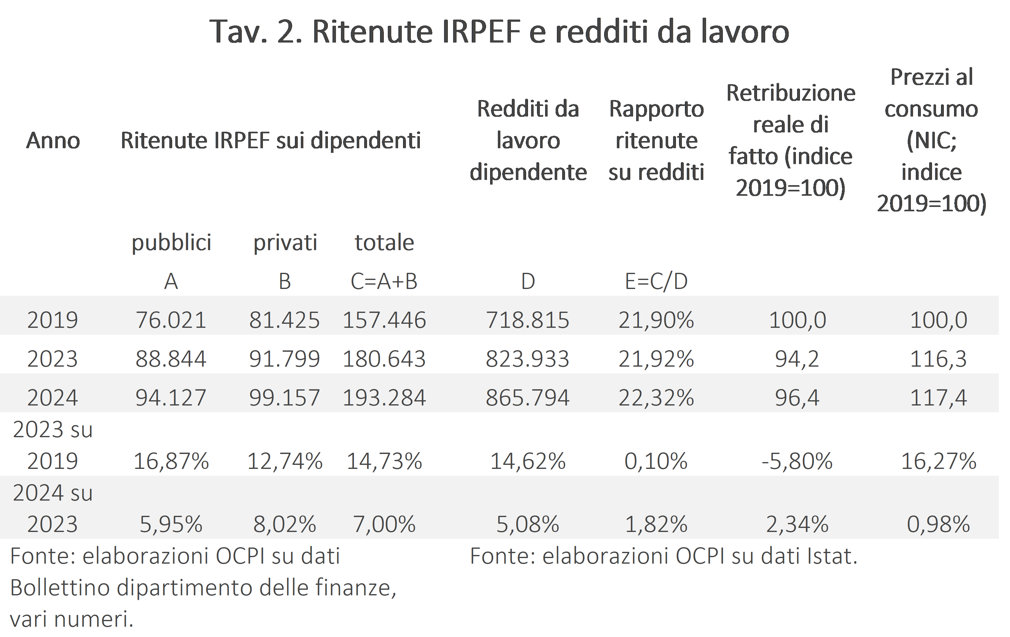 Il lavoro della BCE si ferma al 2023; vale però la pena estendere l’esercizio al 2024, nonostante l’inflazione pressoché nulla (meno dell'1%), perché in quell’anno la pressione fiscale complessiva è salita dal 41,4% circa al 42,6%. A questo fine, si procede come nel calcolo precedente. Si calcola l’aumento del gettito sul lavoro dipendente tra il 2023 e il 2024 (approssimato con l’unica variabile disponibile, le trattenute IRPEF in busta paga) e lo si confronta con la crescita dei redditi da lavoro dipendente (di fonte Istat). Le ritenute aumentano del 7,00%, i redditi del 5,08%: lo scarto è +1,92 punti percentuali, pari a circa 3,46 miliardi. In altre parole, se il sistema fiscale non fosse progressivo, il gettito del 2024 sarebbe aumentato come i redditi (+5,08%) e si sarebbe collocato a 189,821 miliardi. Il differenziale di 3,463 miliardi, rispetto al gettito effettivo di 193,284 miliardi, riflette la progressività dell’imposta personale, ma non coincide con il fiscal drag, dato che nel 2024 le retribuzioni sono cresciute anche in termini reali del 2,34%. Il lavoro già citato delle BCE stima che in Italia, come nella maggior parte dei Paesi europei, la progressività del sistema fiscale fa sì che a un aumento dell’1% della base imponibile corrisponda un aumento dell’1,8-1,9% del gettito, un meccanismo di elasticità chiamato "tax-to-base". Non sorprende, quindi, che a un aumento del 5,08% dei redditi corrisponda un aumento del 7,0% del gettito. In sintesi, il rialzo del gettito 2024 sui dipendenti è spiegato fisiologicamente dalla progressività del sistema fiscale e dalle politiche contributive e non dal fiscal drag.