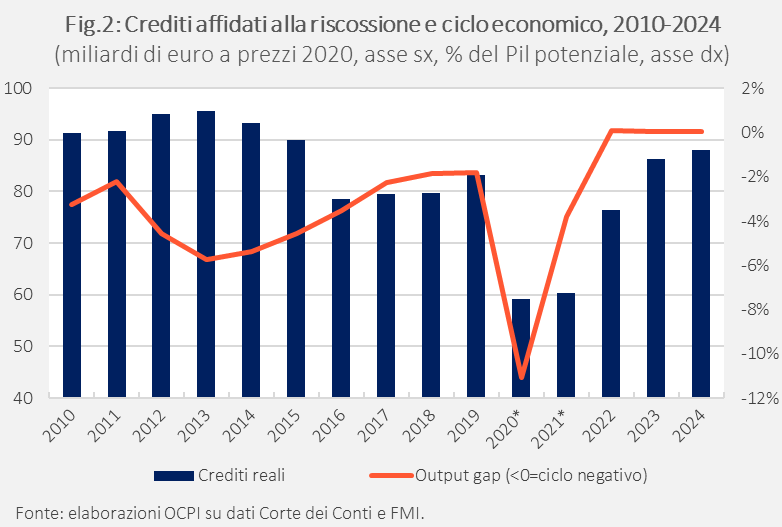 Se la causa principale del mancato pagamento delle cartelle fosse la difficoltà economica, allora nelle fasi di contrazione del ciclo economico (quando il Pil risulta molto inferiore al Pil di piena occupazione) i crediti dovrebbero aumentare rispetto all’accumulo medio, mentre nelle fasi espansive del ciclo questi dovrebbero diminuire. I dati sembrano smentire questa ipotesi (Fig.2): nel 2024, nonostante un periodo di espansione che perdura dal 2022, i crediti affidati, in termini reali, hanno raggiunto il livello più alto dal 2015, quando il ciclo economico era molto più sfavorevole. Inoltre, i crediti affidati nel 2024 sono solo leggermente inferiori a quelli del 2011, anno di piena crisi economica.