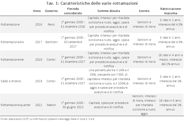 Dal 2016 ci sono state quattro rottamazioni e un “saldo e stralcio”, che ha le caratteristiche di una rottamazione (Tav.1). Nelle prime tre rottamazioni (2016, Governo Renzi; 2017, Governo Gentiloni; 2018, Governo Conte I), la somma dovuta veniva ridotta delle sole sanzioni e interessi di mora; gli altri oneri erano comunque dovuti.[4] Il saldo e stralcio prevedeva il pagamento di una percentuale di capitale e interessi tra scadenza originaria e iscrizione a ruolo, e delle intere spese procedurali e aggio, ma era rivolto solo alle persone fisiche in grave difficoltà economica, relativamente ai debiti derivanti da omessi versamenti di imposte dichiarate.[5] La “rottamazione-quater” (2022; Governo Meloni) invece, valida per i carichi affidati dal 1° gennaio 2000 al 30 giugno 2022, è stata più generosa: oltre a sanzioni e interessi di mora, lo sconto comprendeva anche gli interessi tra scadenza originaria e iscrizione a ruolo e gli aggi di riscossione.[6] Era richiesto quindi solo il pagamento del capitale e delle spese esecutive e di notifica. Inoltre, il pagamento poteva essere rateizzato in un arco di cinque anni pagando un interesse del 2% annuo, contro i due anni al 4,5% delle prime due rottamazioni e i quattro e mezzo al 2% della terza.