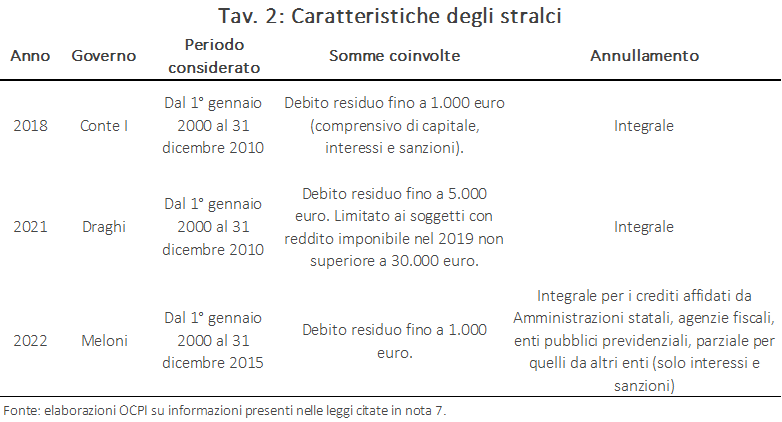 Gli stralci hanno invece annullato, nel complesso, crediti per 82 miliardi: il primo (2018; Governo Conte I) ha agito su tutti i debiti residui fino a 1.000 euro affidati dal 2000 al 2010, per un totale di 37 miliardi; il secondo (2021; Governo Draghi), per gli stessi carichi, ha ampliato l’annullamento fino ai 5.000 euro, limitatamente ai soggetti con reddito inferiore a 30mila euro, condonando 27 miliardi; il terzo (2022; Governo Meloni) ha esteso ai debiti maturati entro il 2015 l’annullamento fino a 1.000 euro, impattando per 19 miliardi (Tav.2).[7]